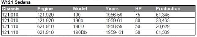 En septiembre de 1958 se añadió un segundo modelo Diesel a la gama de coches: el 190 D. El motor Diesel de 1.9 litros con 50 CV se había desarrollado a partir del motor de gasolina del 190. El nuevo motor ofrece un mayor rendimiento y un funcionamiento más silencioso (en comparación con el 180 D) significó que el nuevo Diesel se convirtió en un éxito inmediato en el mercado